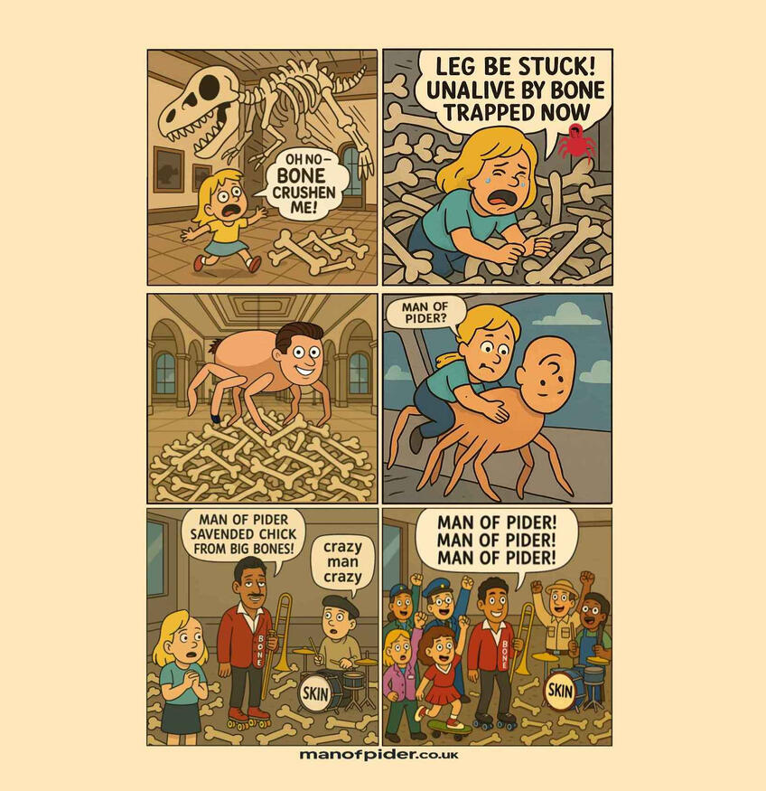 Man of Pider is an original satirical creation. He is not part man, nor part spider — he only looks like man, but he is truly Pider. Entirely Pider. Always Pider. Born from childhood insults and internet chaos, carried by community, and weaving his own corner of culture, Man of Pider crawls ever onward.